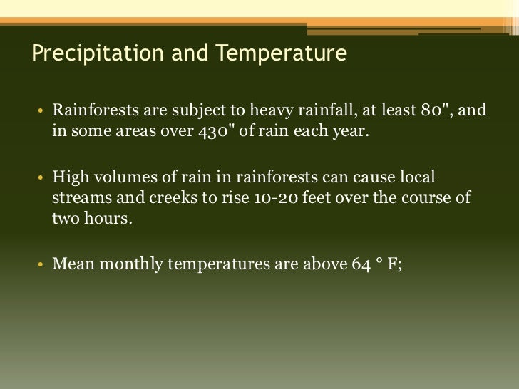 At higher altitudes, temperatures are cooler. Even close to the equator, frost and snow can occur. Precipitation and Climate Both tropical and temperate rainforests are very lush and wet. Rainfall falls regularly throughout the year. The tropical rainforest receives 80-400 inches of rainfall per year. ... Doc Viewer