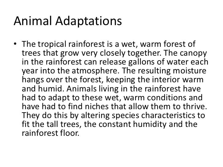 Same is true for rainforest animals. The tropical rainforests across the globe are frequently home to unique animal species that can’t be found anywhere else on earth. Animals that live in the rainforest must adapt to life in this special ecosystem. In order to be called a rainforest an area must get at least 80 inches of rainfall a year. ... Fetch Full Source